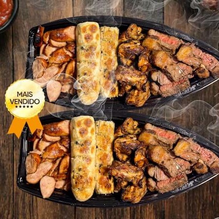 Barca Pura Suculência: O Expresso da Felicidade! Viva uma experiência premium em Curitiba: pague 300 g e leve 600 g de cortes selecionados, grelhados na brasa com perfeição. Cada barca traz: 200de de Fraldinha prime, suculenta 150 g de Frango Tulipinha (petisco) temperado e crocante 150 g de Linguiça de Frango da melhor, levemente defumada Farofa crocante exclusiva (100 g) 1 pão de alho quen