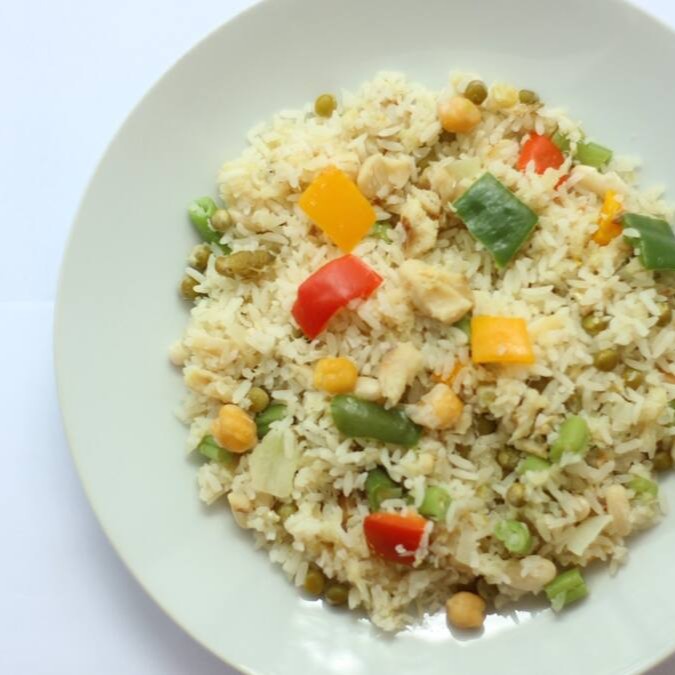 Arroz branco, bacalhau desfiado, peixe salgado desfiado, grão de bico, azeitona verde, ovo cozido, pimentão, feijão branco, ervilha, arroz, temperos.