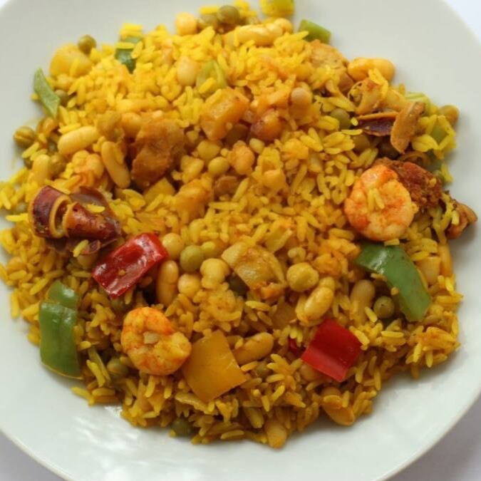 Arroz, pimentões, ervilha, feijão branco, lula, camarão, peixe, açafrão, marisco e temperos.