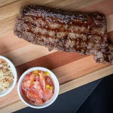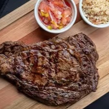 Bife de Chorizo, grelhado à perfeição, acompanhado de farofa e vinagrete, ideal para os amantes de carne.