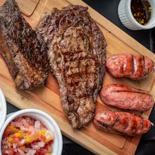 Seleção de carnes incluindo Bife de Chorizo, Bife Ancho e Linguiça Toscana (Aprox 800g de carne in natura), Acompanha Farofa, Vinagrete, Chimichurri e Maionese (Aprox 500g em acompanhamentos). Ideal para compartilhar e saborear com a família e amigos.