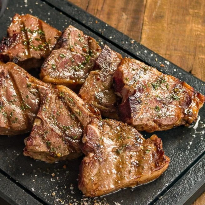 T-Bone de cordeiro, grelhado com maestria, acompanhado de farofa e vinagrete.