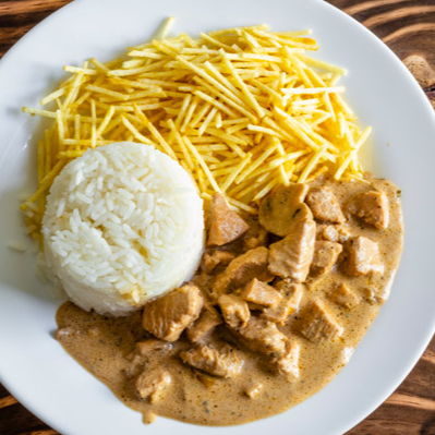 O strogonoff de carne com arroz e batata palha é um prato clássico, cremoso e muito popular na culinária brasileira, conhecido por ser uma refeição caseira, reconfortante e cheia de sabor.