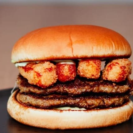 Inspirado na Califa, o preferido do patrão, pão brioche, maionese Barolla, geléia de pimenta, 2 Smash burguer artesanal 80g cada, bacon em tiras crocantes, rúcula e queijo empanado crocante.