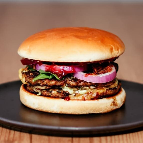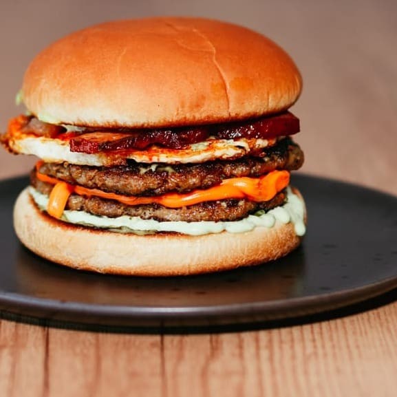 Para os amantes de Bacon, vindo com pão brioche, maionese Barolla, 2 Smash burguer artesanal 80g cada, Bacon em cubos crispy, rúcula, cebola roxa, queijo prato.