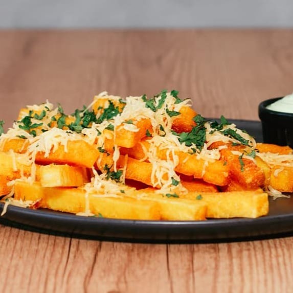 Porção de polenta bem crocante com bacon e queijo opcional: cheddar ou cream cheese. Acompanha maionese Barolla, ideal para quem busca um toque especial. 400 Gramas