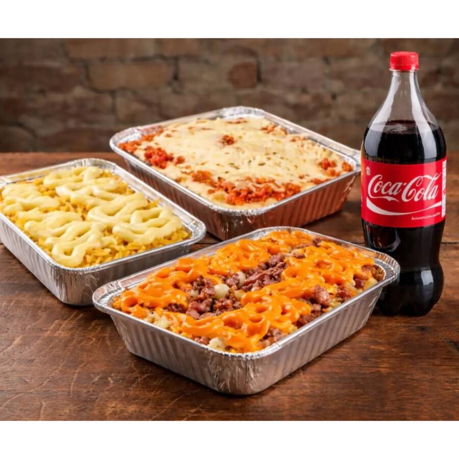Combo 3 Batatas Recheadas (sabores à escolha) + Coca-Cola 1l. Aproximadamente 1200g. Serve até 3 pessoas.