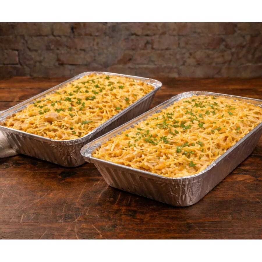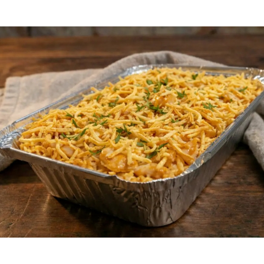 2 deliciosas batatas recheadas com strogonoff de frango, acompanhadas de batata palha em embalagem separada. Aproximadamente 800g, serve até 2 pessoas.