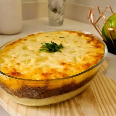 Delicioso purê de batata recheada com carne moída e gratinado com mussarela.