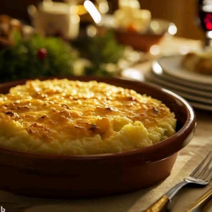 Delicioso purê de batata recheada com bacon, gratinado com mussarela.