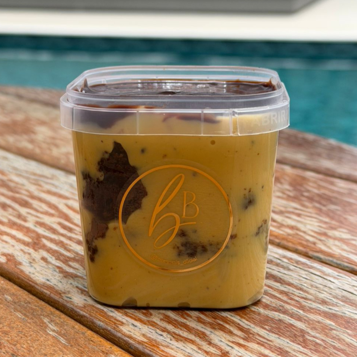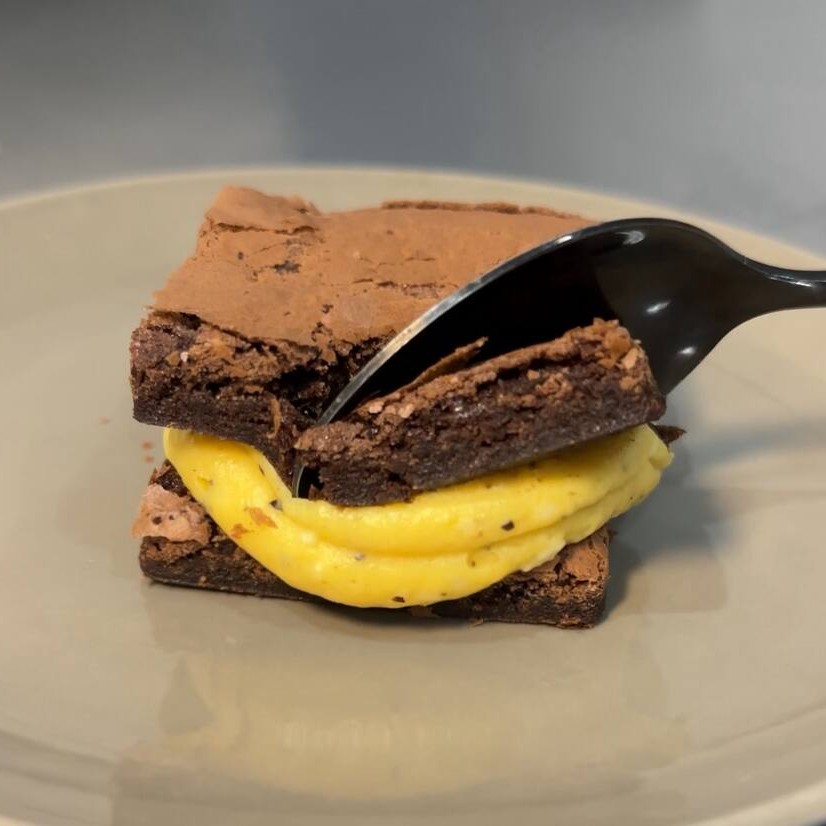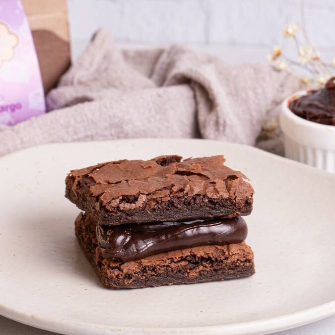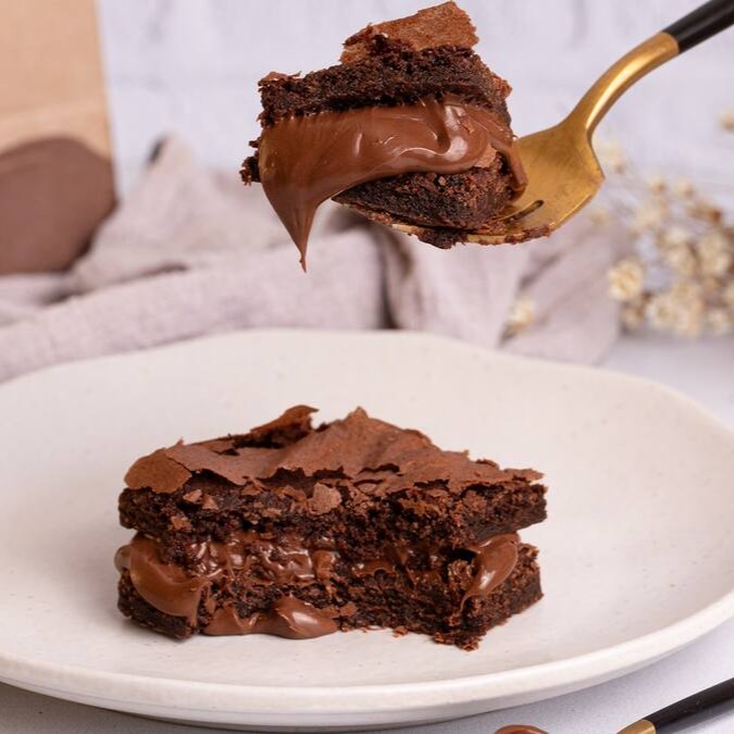 Brownie com uma camada de brigadeiro preto e uma camada da nossa Nutella crocante!