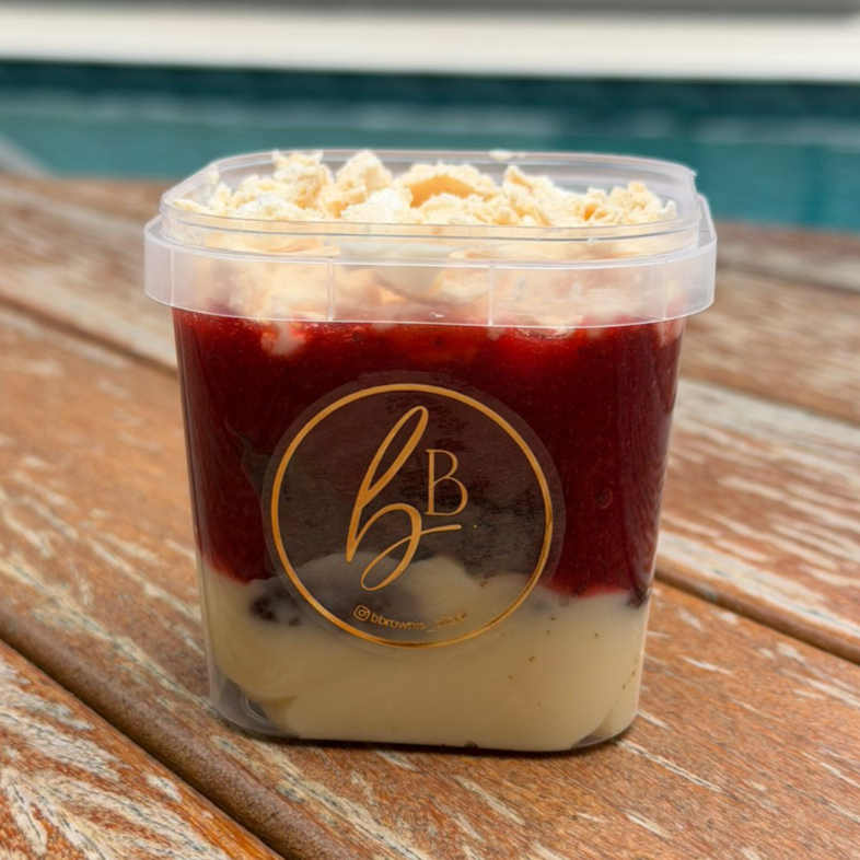 Inspirado na pavlova clássica. Pote com creme de baunilha, chantilly fresco, geleia artesanal de morango, brownie em pedaços e suspiro crocante. Uma sobremesa leve e refrescante. 200g