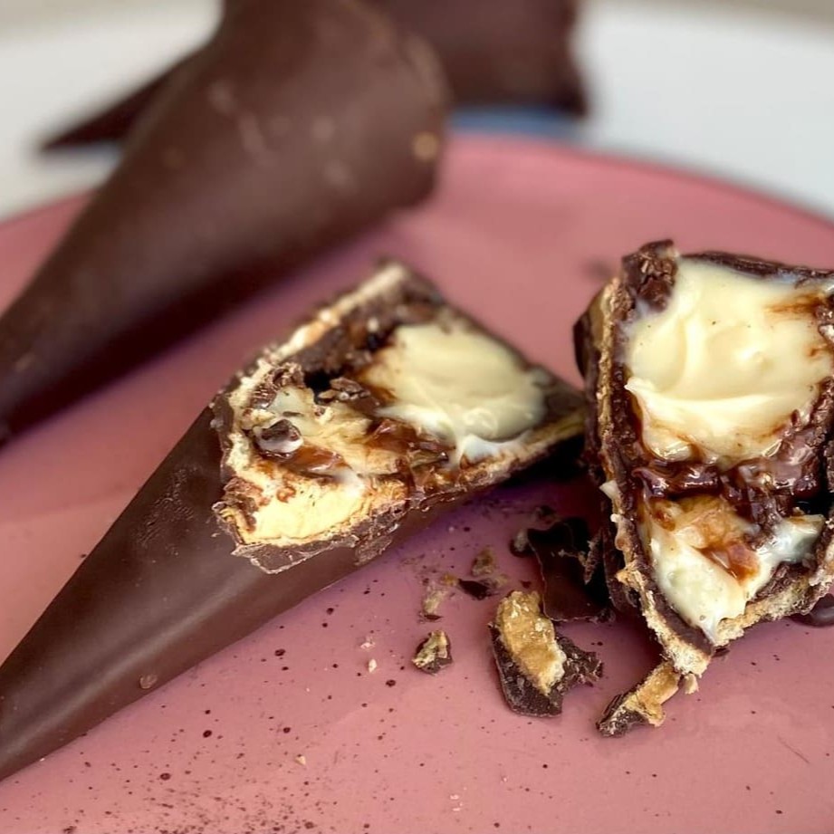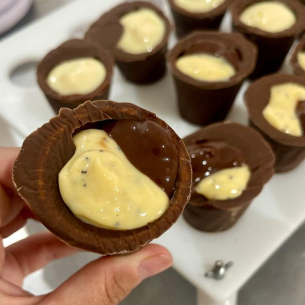 Casquinha crocante banhada no chocolate, recheada de brigadeiro cremoso de Ninho com Nutella.