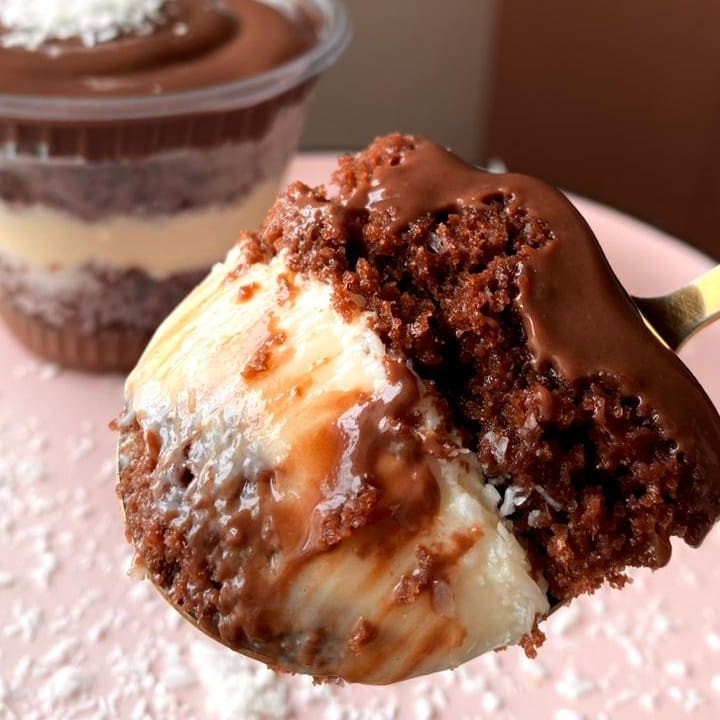 Composto por nosso brigadeiro cremoso, intercalado com pão de ló de chocolate molhadinho e nosso creme de coco delicioso.