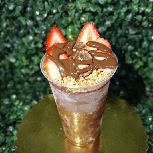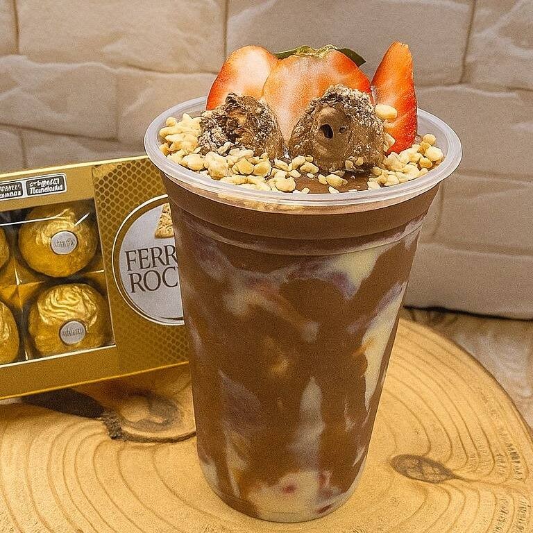 Açai acompanha creme de avela,leite condensado, Morango,amendoim Granulado e Ferreiro Rocher.