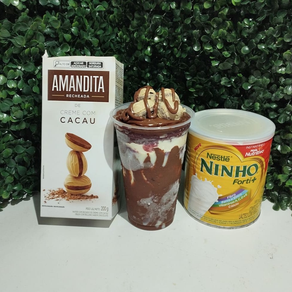 Açaí acompanhado de leite condensado, leite em pó, Creme de avela e 4unidades de Amandita