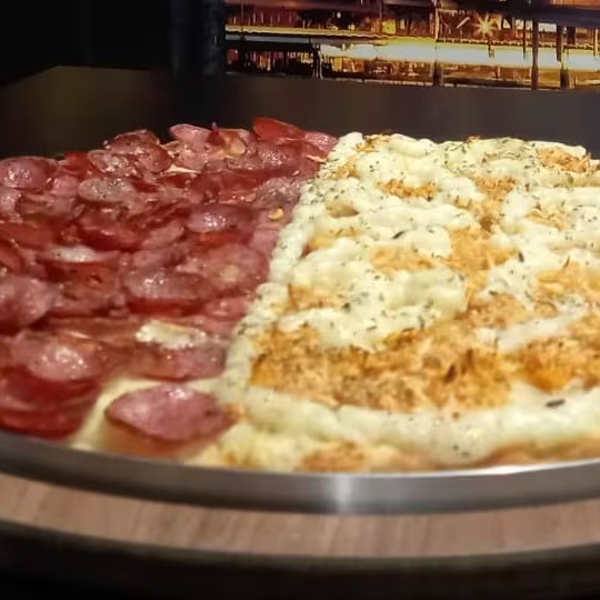 Pizza Grande 2 sabores: frango Catupiry e Calabresa.