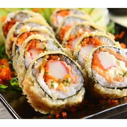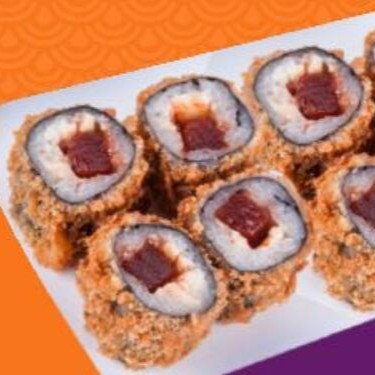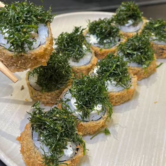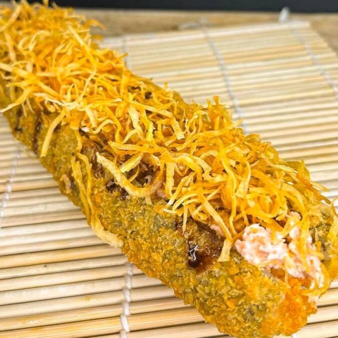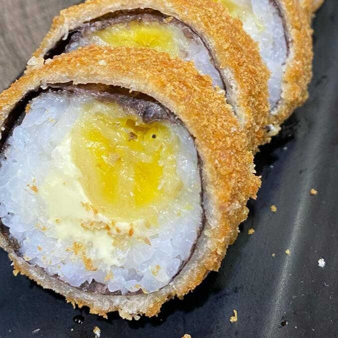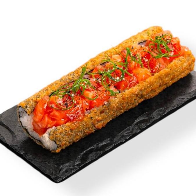 Salmão e cream cheese, Kani, Cebolinha, Pimenta Sweet Chili, empanado na farinha panco e frito.