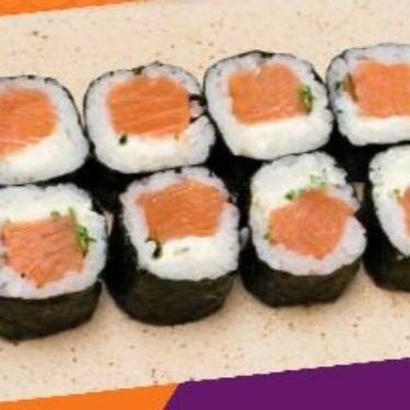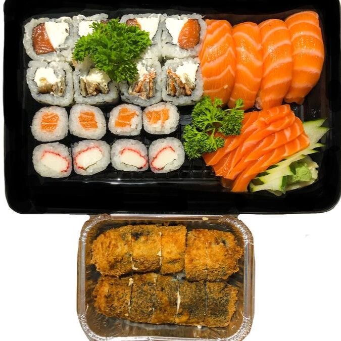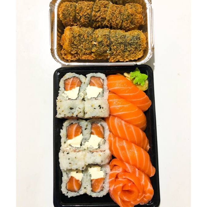 8 Uramaki Filadélfia. 4 Sashimi salmão. 4 Hossomaki Salmão. 8 Hot Filadélfia.
