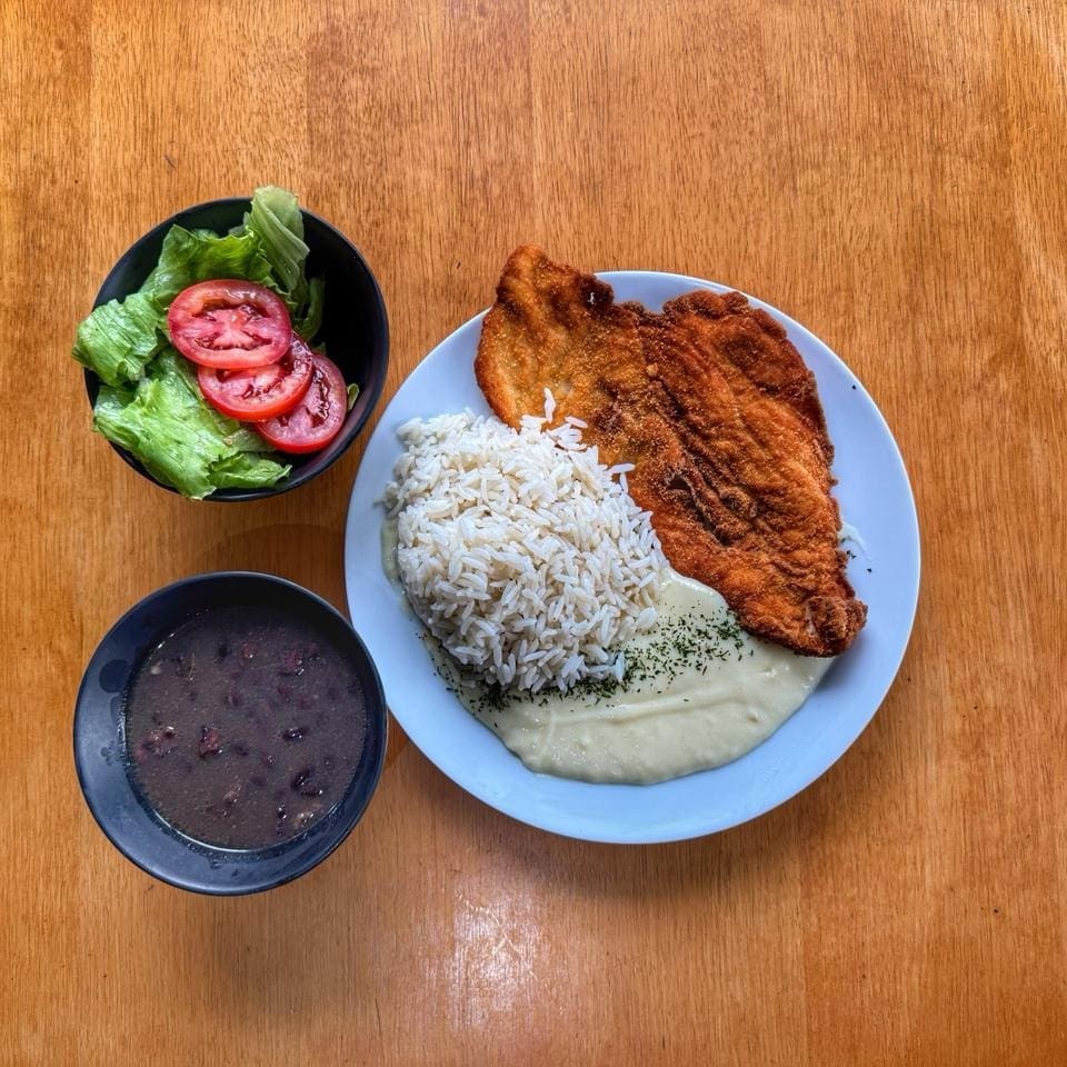Arroz soltinho, feijão preto com pedacinhos de bacon, purê de batata cremoso e um filé de peito de frango marinado no tempero especial da casa e empanada na Panko. Acompanha salada fresca de alface e tomate.