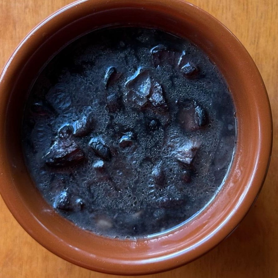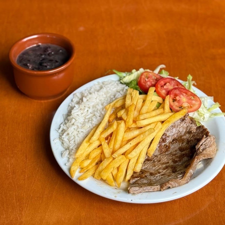Arroz soltinho, feijão preto com pedacinhos de bacon, batata frita e um belo bife com tempero da casa feito na chapa. Acompanha uma salada fresca de alface e tomate.