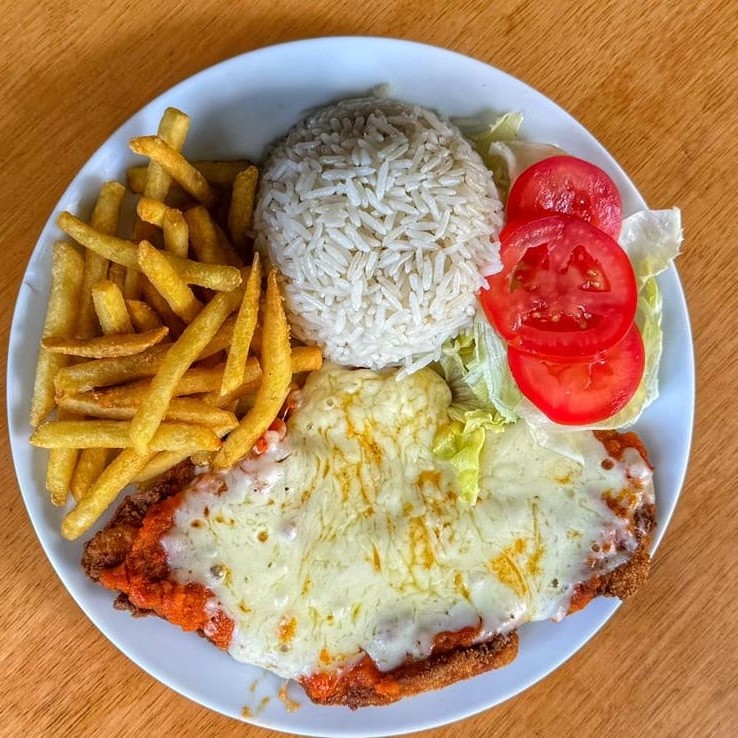 Arroz soltinho, batata frita e filé de peito a parmegiana com molho de tomate artesanal feito na casa. Acompanha salada fresca de alface e tomate.