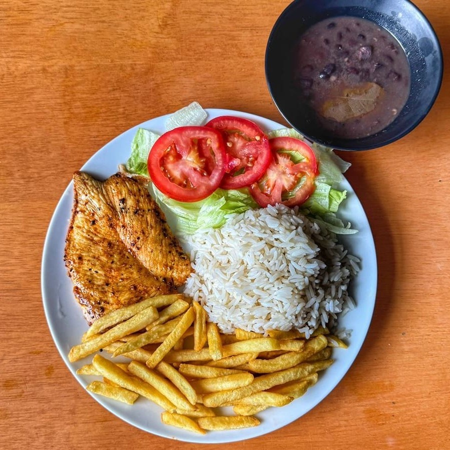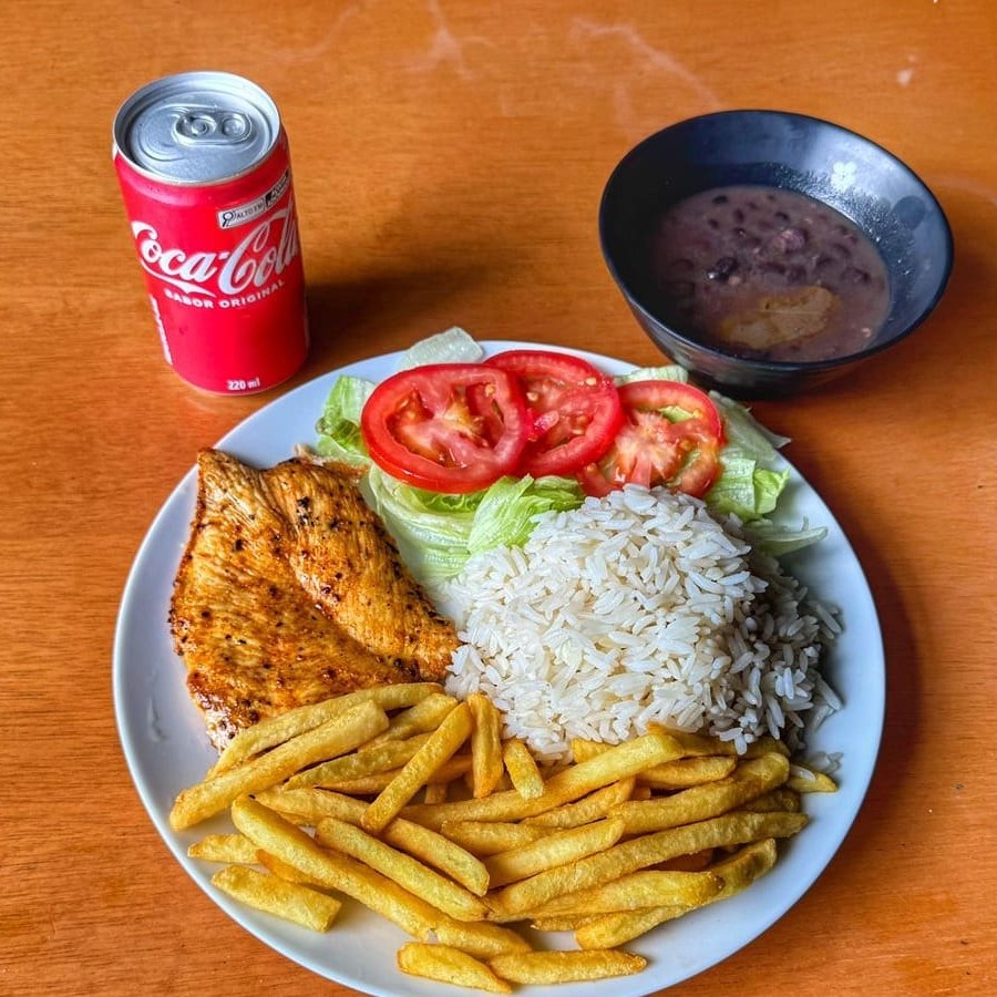Arroz soltinho, feijão preto cremoso com pedacinhos de bacon, batata frita e um filé de peito marinado no tempero da casa e feito na chapa. Acompanha uma salada fresca de alface e tomate.