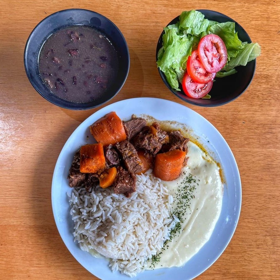 Arroz soltinho, feijão preto, purê de batata cremoso e carne de panela com cenoura. Acompanha saladinha de alface e tomate.