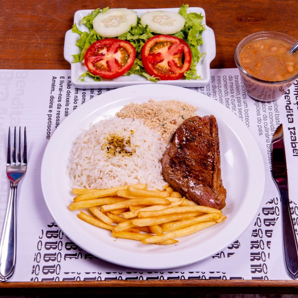 Picanha suculenta e grelhada no ponto ideal, acompanhada de arroz branco soltinho, feijão caseiro, farofa crocante, batata frita douradinha e uma salada fresca com alface, tomate e cenoura. Um prato completo, saboroso e perfeito para o seu almoço!