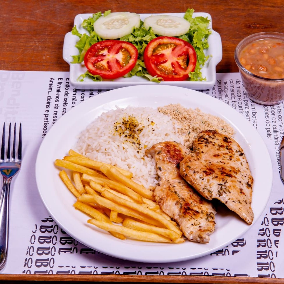 Filé de frango grelhado no ponto certo, suculento e bem temperado. Acompanha arroz branco soltinho, feijão caseiro, farofa crocante, batata frita douradinha e salada fresca com alface, tomate e cenoura. A refeição ideal para o seu Dia a Dia, com muito sabor e equilíbrio!