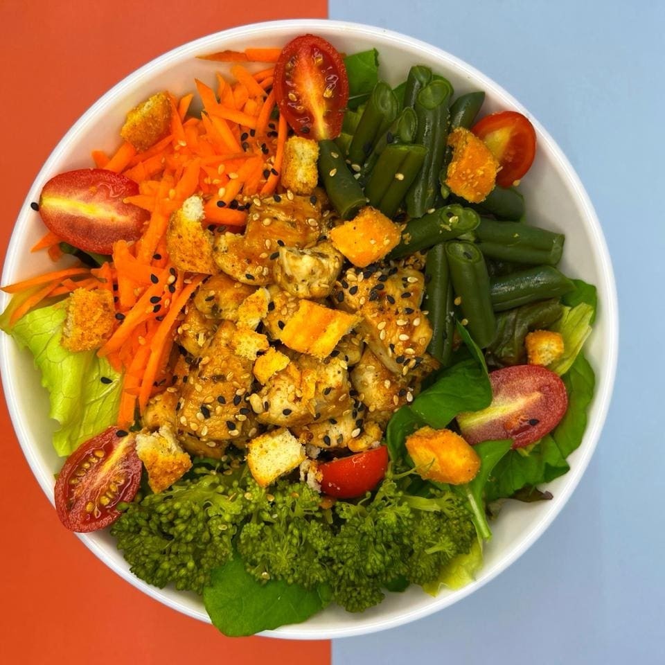Base: mix de folhas (alface, rúcula e agrião) com frango em cubos, manga em cubos, cenoura ralada e castanhas-de-caju. Molho: Mostarda e mel Combinação tropical com toque adocicado e textura crocante — leve, saborosa e cheia de energia!