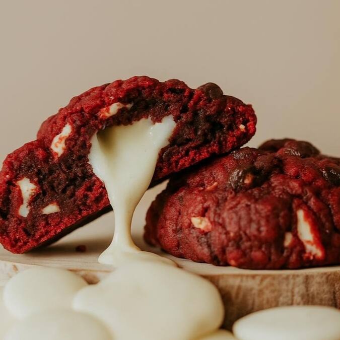 Nosso Cookie Red Velvet é puro prazer! Com massa amanteigada, casquinha crocante por fora e macio por dentro, leva pasta de baunilha, chocolate nobre branco e um recheio cremoso de cream cheese. Cada unidade tem 100g de sabor inesquecível!