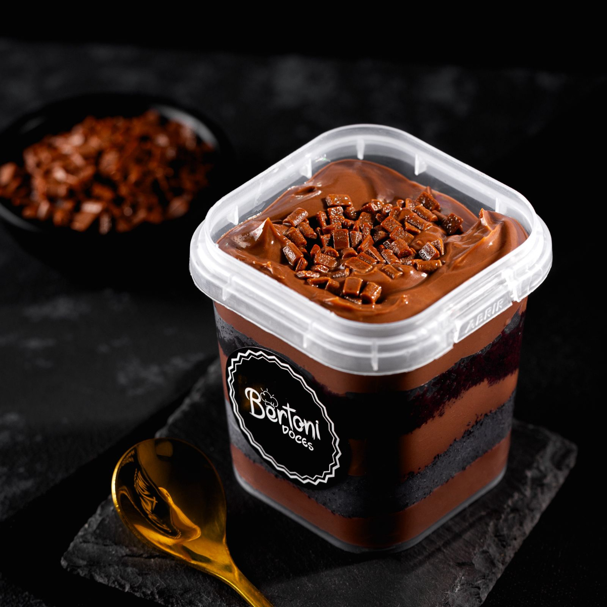 Irresistíveis camadas de mousse e creme de leite Ninho, nosso delicioso brownie, uvas sem semente, ganache de chocolate finalizado com granulado de chocolate nobre. (250ml)