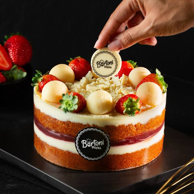 de brigadeiro branco e geleia de morango. Decorado com morangos frescos e docinhos de leite Ninho. (Aprox. 1kg) - de 8 a 10 fatias