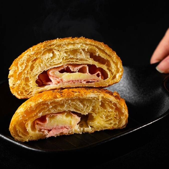 Croissant recheado com presunto e queijo, com toque de orégano.