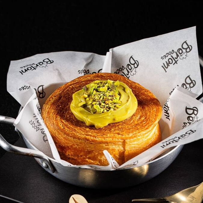 Croissant redondo macio por dentro e crocante por fora, recheado com nosso brigadeiro de Pistache.