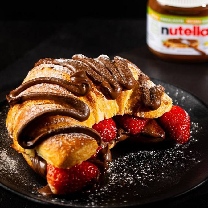 Croissant macio e crocante por fora, recheado com Nutella pura e morangos frescos. Decorado com Nutella e açúcar de confeiteiro.