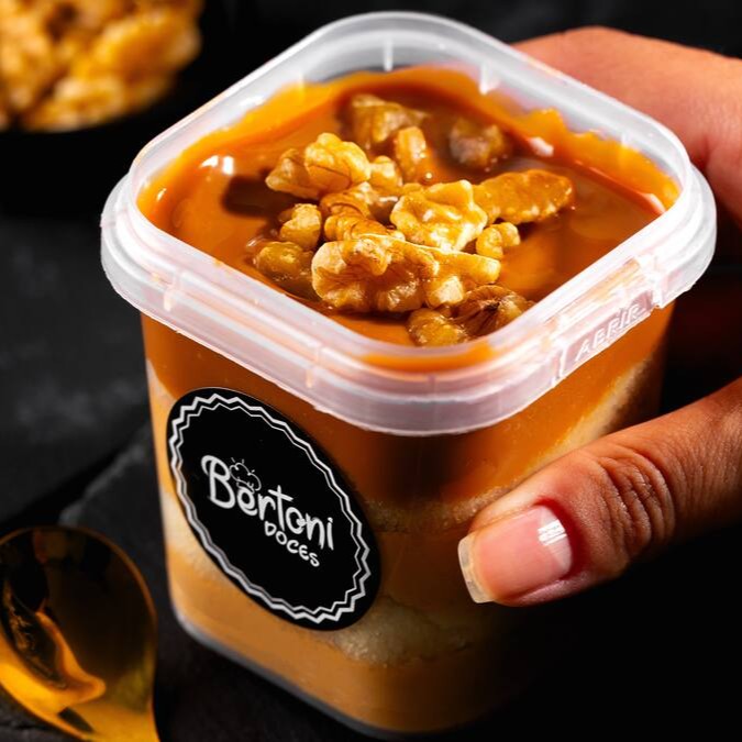 Creme de nozes com doce de leite suave, pão de ló fofinha, finalizado com doce de leite suave e nozes. (220ml)