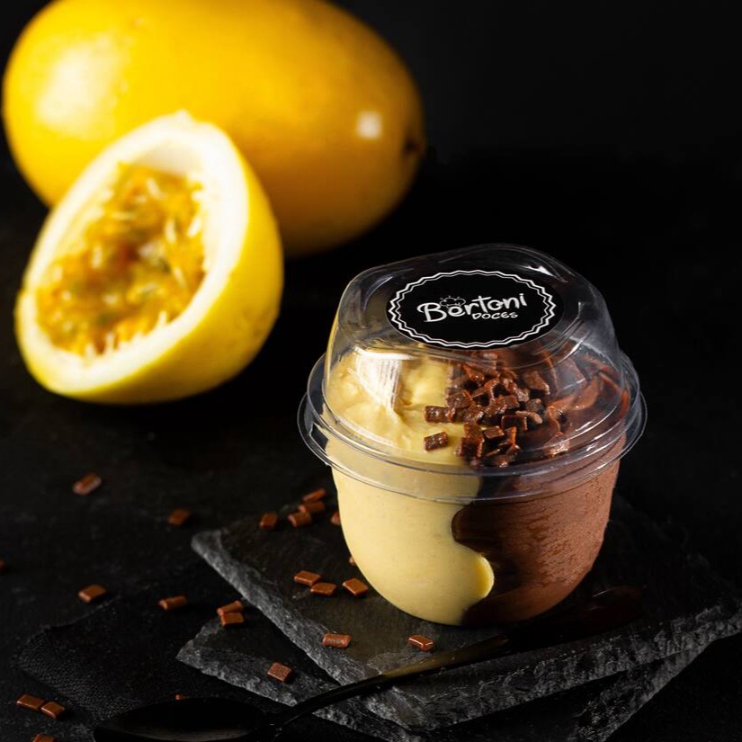Potinho com brigadeiro cremoso de maracujá (feito com a redução da fruta natural), e brigadeiro de chocolate. Finalizado com granulado de chocolate ao leite. (Aprox. 160g)