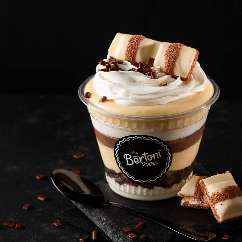 Mousse de Ninho suave, creme de Ninho, Ouro Branco picado, finalizado com ganache de chocolate nobre, meio bombom, e risquinhos de chocolate branco. Novo tamanho: 250g Obs.: a Bertoni Doces não altera nenhum produto ou retira/adiciona ingrediente.