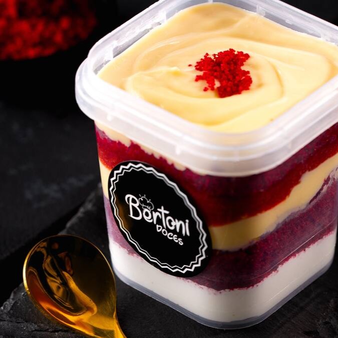 Mousse de Ninho, massa Red Velvet com leve toque de cacau, geleia artesanal de morango e creme de Ninho. (220ml)