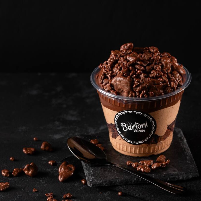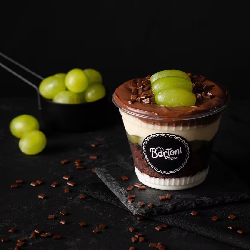 Irresistíveis camadas de mousse e creme de leite Ninho, nosso delicioso brownie, uvas sem semente, ganache de chocolate finalizado com granulado de chocolate nobre. (250ml)