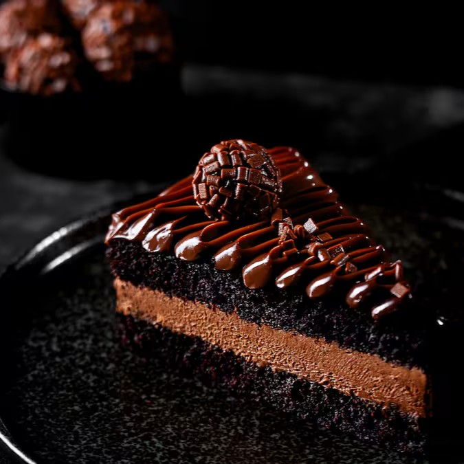 Massa fofinha de chocolate, recheada com mousse de chocolate, finalizada com brigadeiro, um docinho e granulado de chocolate ao leite.