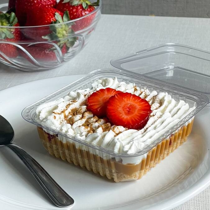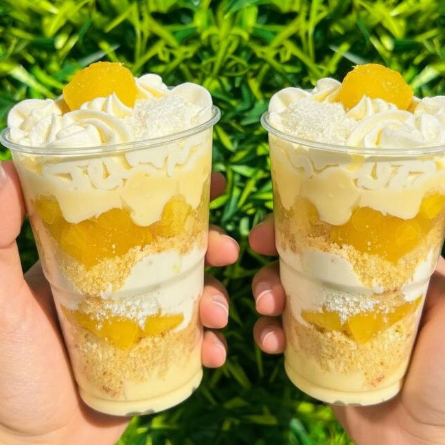 Deguste compartilhando! 2 copos com Deliciosos com pedaços de Abacaxi selecionados, Creme de Ninho, Mousse de Ninho, Bolo de baunilha fresquinho e Coco Ralado..