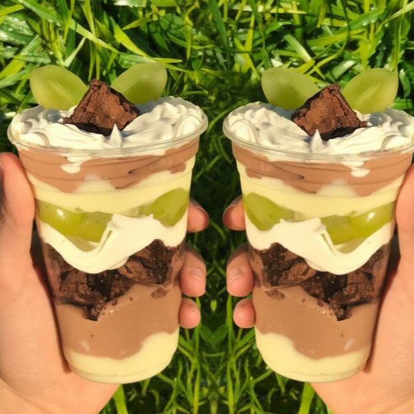 1 Copo de Uva Cremousse, com creme de Ninho, Mousse de Ninho, Mousse de Chocolate, Uvas docinhas pedaços de Brownie.