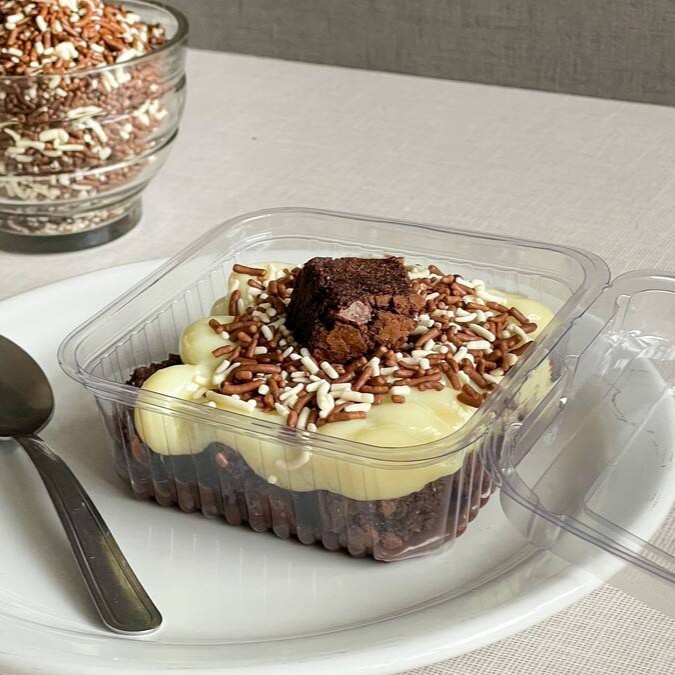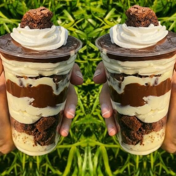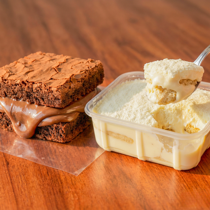 A união definitiva de sabores! Leve 1 Brownie super chocolatudo com casquinha crocante e recheio generoso de Brigadeiro + 1 Pavê de Leite Ninho cremoso, intercalado com camadas de bolacha maisena. A felicidade em dobro que você merece hoje!