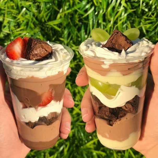Para você ou para dividir! Copo Uva Cremousse, a união de cremes e mousses, um sabor inaqualável. Com creme e mousse de Ninho, mousse de chocolate, uvas thompson docinhas e pedaços de Brownie.