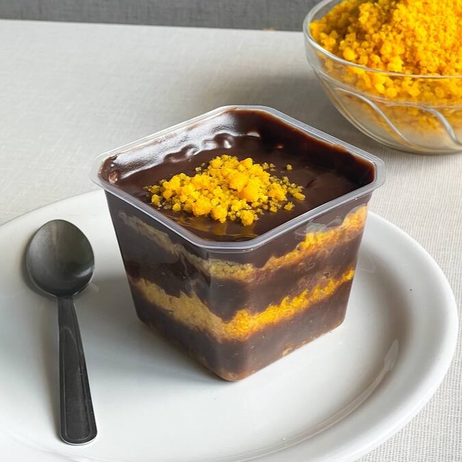 Ingredientes: Creme de Chocolate com Bolacha de Maisena, coberto levemente com Pó de Cacau 50%