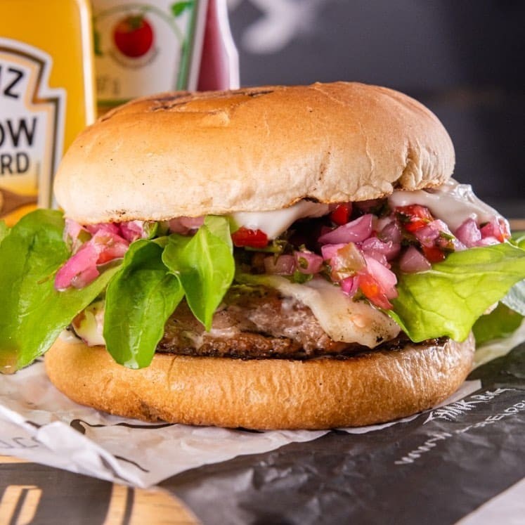 Descubra a combinação irresistível do nosso hambúrguer suíno, com vinagrete fresco e queijo coalho artesanal. Este combo inclui **2 hambúrgueres suínos** de 120g, acompanhados de **vinagrete da casa** com pimenta biquinho e tomate cereja, **rúcula**, **queijo coalho** e **molho inglês** à base de cebola com um toque de mostarda. Favorita a loja para receber ofertas exclusivas! (Imagem ilustrativa com um hambúrguer)