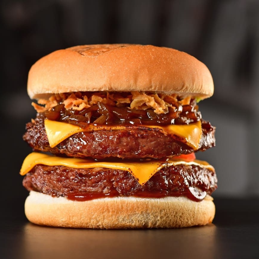 Dobre o prazer e a suculência! Prepare-se para a experiência definitiva com **dois hambúrgueres Black Angus** de **picanha (120g cada)**, envoltos em cremoso **queijo cheddar** e a crocância da **cebola crispy**. Complementado pela frescura da **alface** e do **tomate**, e o toque marcante do nosso **molho defumado**, tudo em um **pão macio** e perfeito. Para não perder nenhuma novidade e receber ofertas especiais, favorite nossa loja!